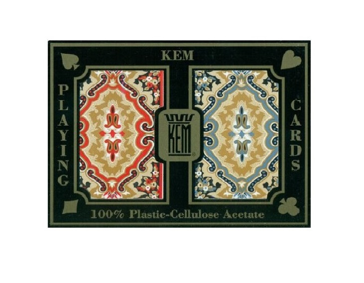 Kem Paisley Playing Cards: Bridge Size, Regular Index 2-Deck Set. Includes one red paisley deck and one blue paisley deck. Bridge-size cards measure 3.5 inches high x 2.25 inches wide. Each deck includes two jokers – one red joker and one black joker. In addition to being perfect for playing bridge, bridge-size cards are great for any game which requires a player to hold a lot of cards in their hand such as Canasta. Made in the USA of 100% plastic.