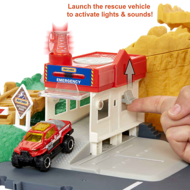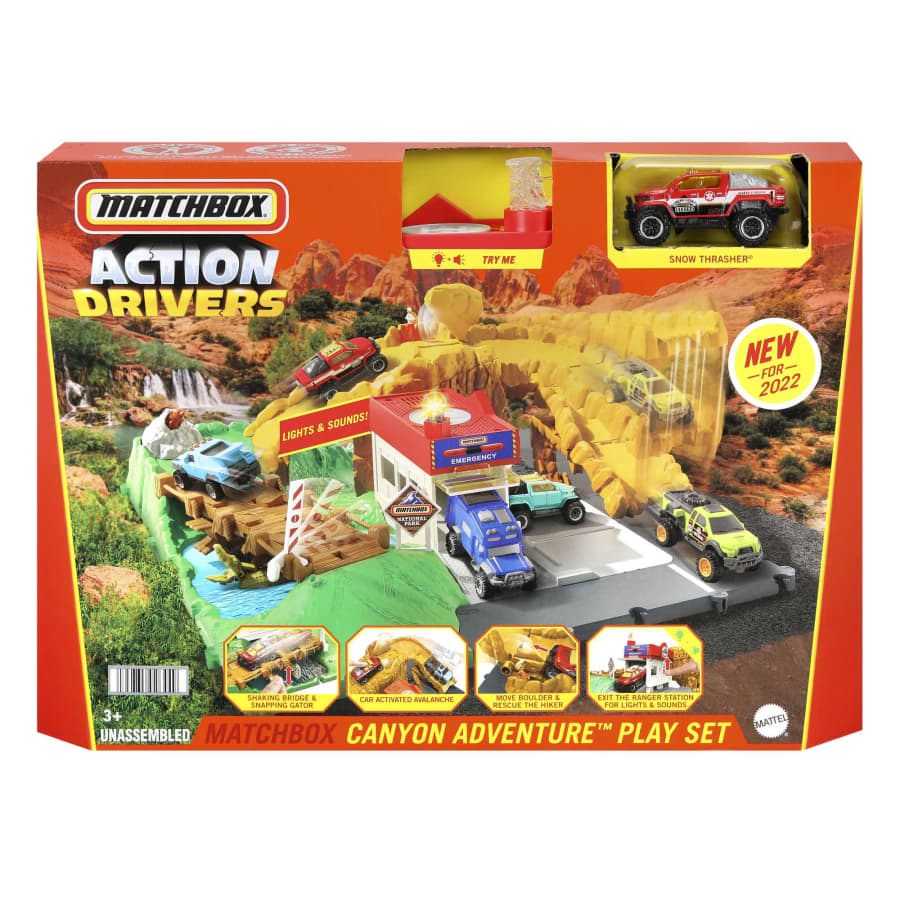- Kids drive the off-road adventure with the Matchbox Canyon Adventure playset! There’s lots to explore with lights and sounds, car- and kid-activated hazards and moving gates!