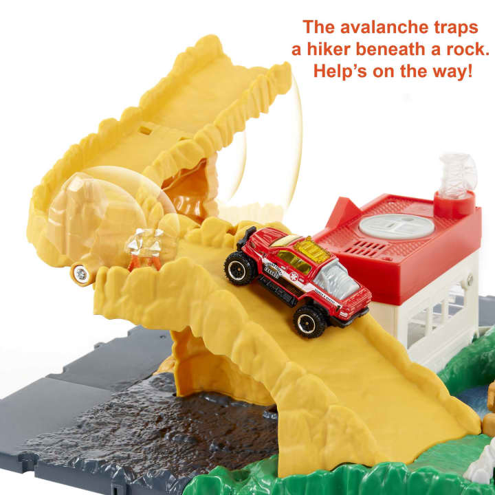 The treacherous canyon terrain can make for some exciting adventures and some daring ones, but kid heroes are coming to the rescue! Kids can drive their Matchbox vehicles from the ranger station and navigate the rocky landscape to stave off wildlife and rescue hikers. Watch out for the car-activated avalanche! This packed playset features fun push-around play as well as lights and sounds to enhance the realism. It comes with one Matchbox vehicle and connects to other Matchbox and Hot Wheels sets for extended adventure. It’s made from 40% ISCC-Certified plastics* and was designed for easy disassembly and recycling. Colors and decorations may vary. *Mass Balance Approach.