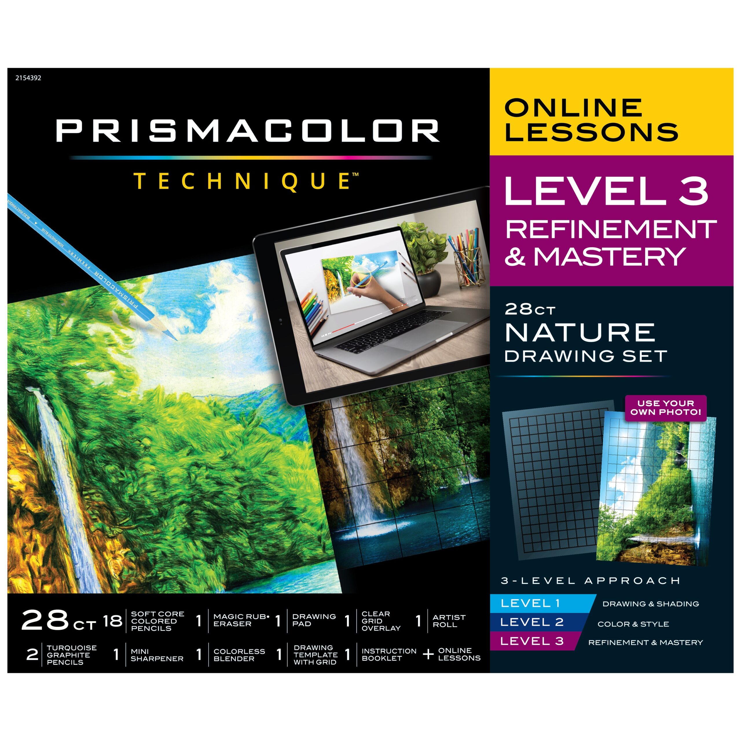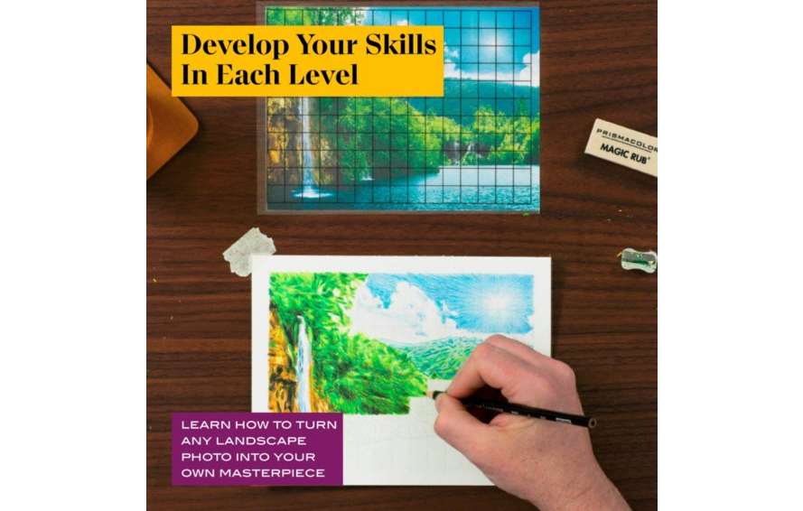 Learn art at your own pace from the comfort of your home with the Prismacolor Technique. Each Prismacolor Technique set features a unique coupon code for access to digital art lessons you can’t get anywhere else. Instructed by Prismacolor artists, each lesson will teach you how to use the professional-grade art supplies included in the set to create a piece of art you will cherish. The Level 3 Nature Drawing Set is designed for those who have built up some skill and confidence in art. You’ll learn how to take your skills to the next level by recreating any landscape or nature photo using reference grids. The set features Prismacolor colored pencils with rich cores for smooth color laydown and an artist roll case so you can store and carry your art tools. You’ll also receive graphite pencils, a clear reference grid overlay, a colorless blender, an eraser, a drawing pad, a mini sharpener, a drawing template with a grid, a set of instructions, and hours of online content to learn at your convenience!